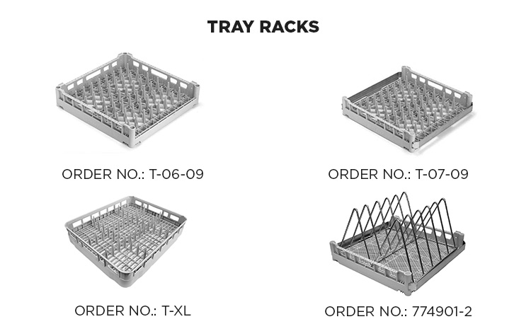 | T-06-09 | Koš na tácy 500 x 500 mm pro 9 GN nebo EN táců, otevřený na jedné straně (není vhodný pro průchozí myčky nádobí v rohovém umístění) |