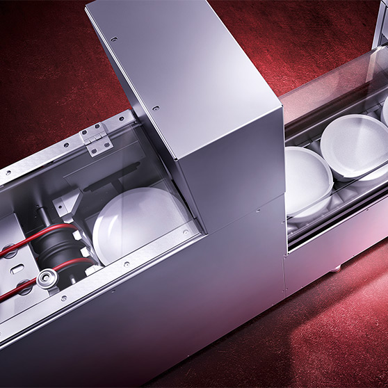Zařízení pro automatické odebírání talířů ze stohu se připojuje k výstupní straně pásové myčky nádobí. Talíře jsou automaticky přepravovány z oddělené dráhy pro talíře v pásové myčce nádobí do následného zařízení pro odebírání talířů ze stohu.