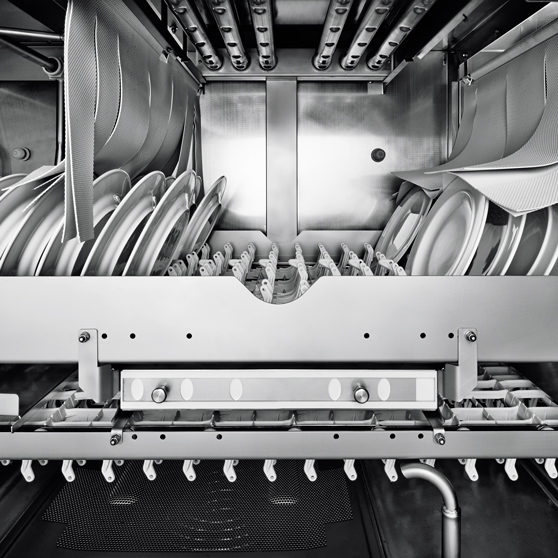 Vzhledem ke svému speciálnímu designu zajišťuje transportní pás DIRECT, aby se mycí voda dostávala do optimálního kontaktu s nádobím.
