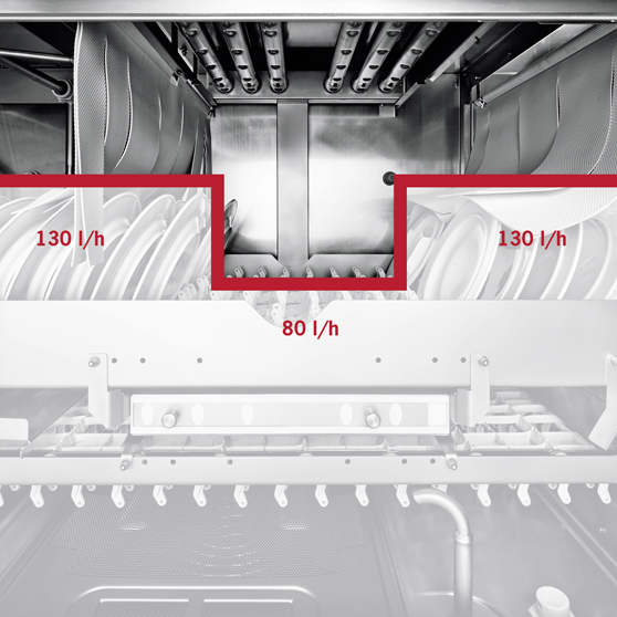 VAŠE VÝHODA: Tento systém například zabraňuje zbytečně vysoké spotřebě vody při nízkých rychlostech stroje. Na umývané nádobí je vždy aplikováno stejné množství vody nehledě na rychlost stroje, díky čemuž je dosahováno rovnoměrného výsledku mytí.